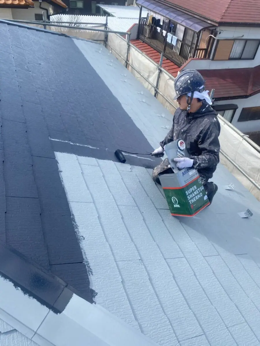 屋根は風雨や太陽光などで下地が傷んでいますので、しっかり塗料を塗り込んで、下地へのクサビとなる塗膜を作ることが大切です。