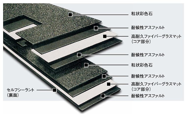 アスファルトシングルは、アスファルトを含浸させたガラス繊維の基材をもつ屋根材です。