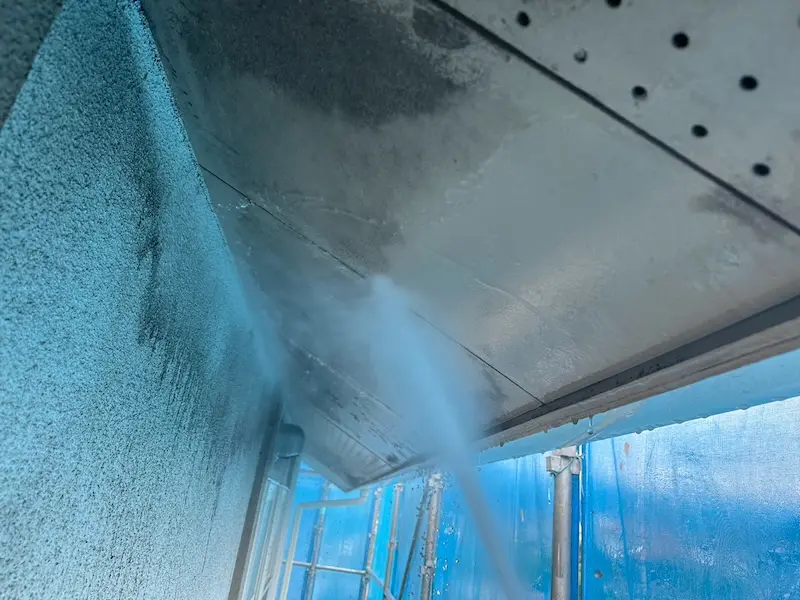 塗装工事では建物の汚れや古くなった塗膜を洗い流すために高圧洗浄を行なっております。