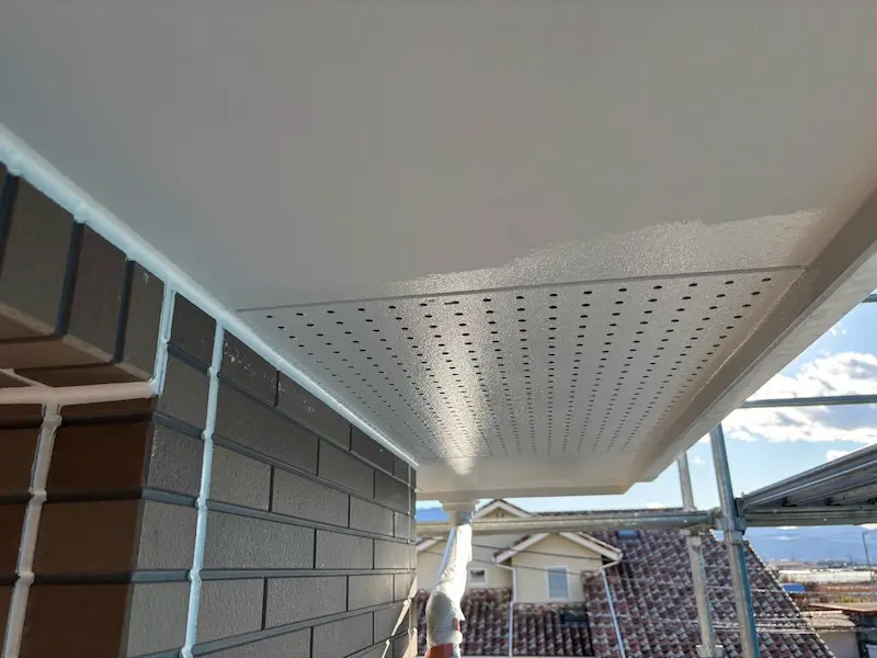 こちらの工事では外壁との取り合い部をシール処理し、軒天井全体を塗装しました。