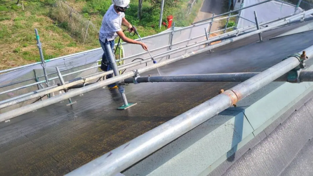 山梨県甲府市の屋根塗装工事の現場にて施工前の点検と高圧洗浄を行いました。