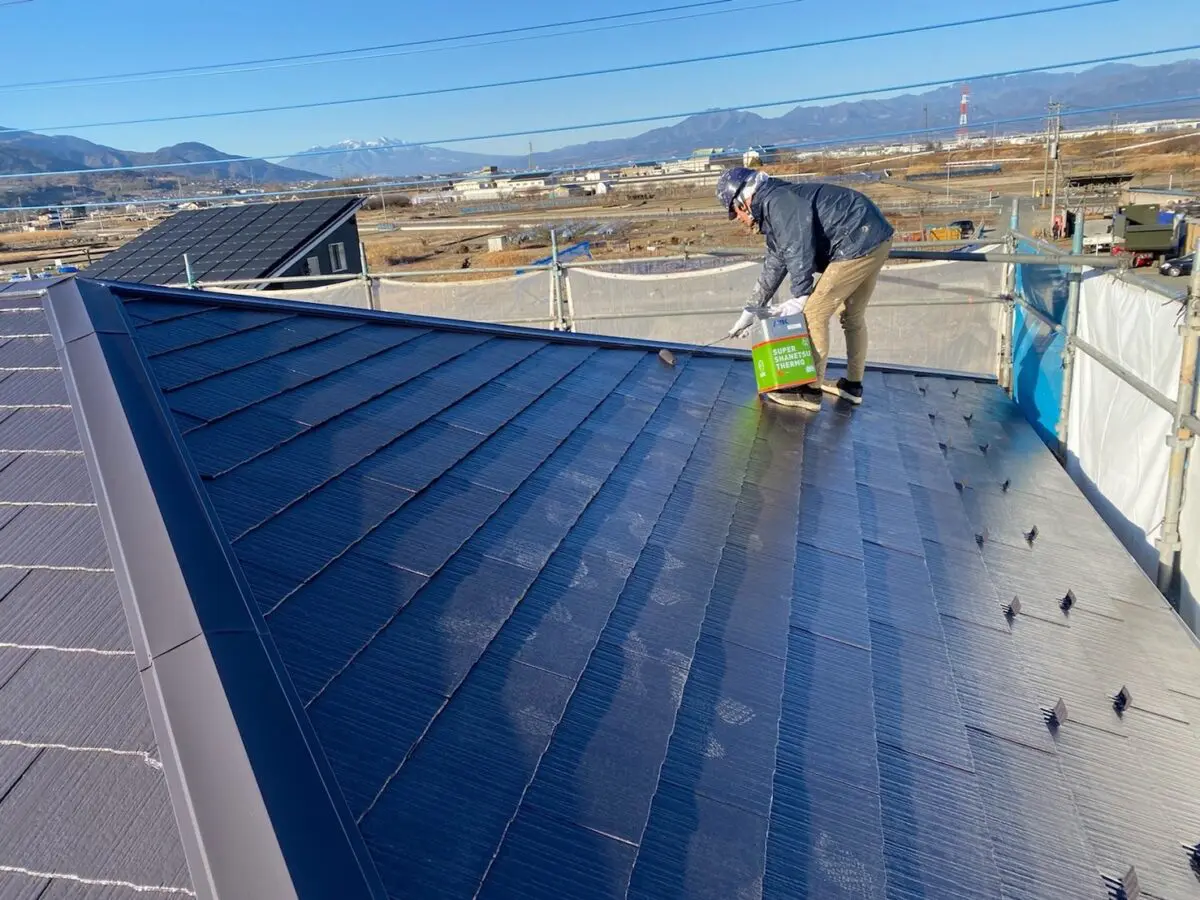 山梨県山梨市の屋根塗装工事にて屋根の中塗り〜上塗りを行いました。