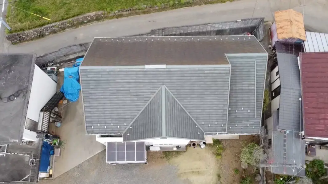 上の写真はドローンを飛ばして屋根を撮影しています。