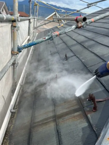 今回工事する屋根は劣化が進んでいるので、破損がないように水圧を調整しながら洗浄しました。