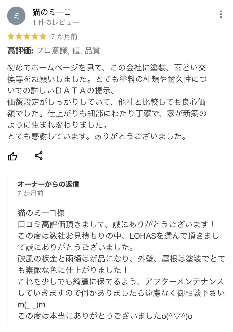 LOHASで施工させて頂いたお客様、ありがとうございました。 たくさんのお客様よりご感想を頂くことができ、皆様のお声が私たちの元気の源になります。 エリア別にお客様の声を見る 山梨県 富士吉田市 甲府市 山梨市 大月市 韮崎市 南アルプス市 笛吹市 北杜市 上野原市 甲州市 中央市 とても塗料の種類や耐久性についての詳しいDATAの提示、 価額設定がしっかりしていて、他社と比較しても良心価額でした。 山梨県甲州市の外壁塗装後のお客様の声(Google口コミより) この詳細を見る 初めてホームページを見て、この会社に塗装、雨どい交換等をお願いしました。とても塗料の種類や耐久性についての詳しいDATAの提示、 価額設定がしっかりしていて、他社と比較しても良心価額でした。仕上がりも細部にわたり丁寧で、家が新築のように生まれ変わりました。 とても感謝しています。ありがとうございました。 この詳細を見る 新着順 古い順 1 / 11