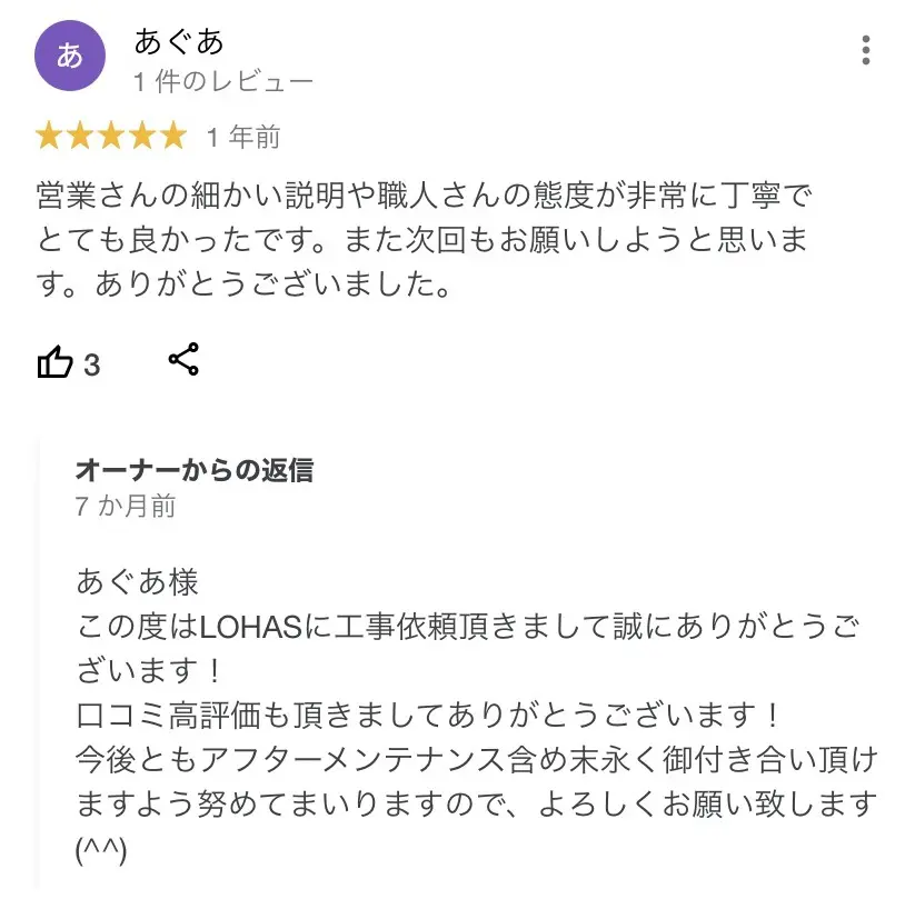 補償も付いていますし、地元密着なのでいつでも相談できるのでとても安心です。ロハスさんにお願いして本当に良かったです。